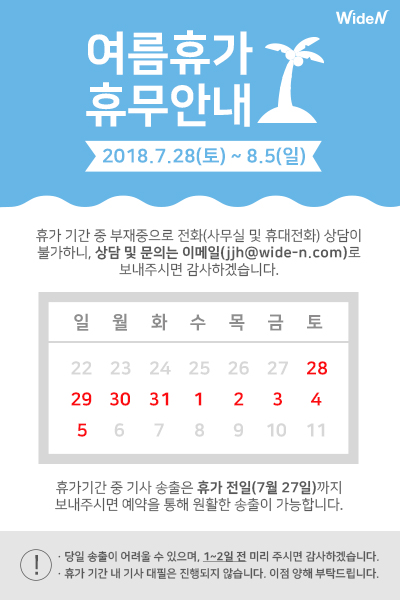 ÈÞ°¡ ±â°£ Áß ±â»ç´Â ÈÞ°¡ÀÏ ÀüÀÏÀÎ 7¿ù 27ÀÏ ¿ÀÀü ±îÁö º¸³»ÁÖ½Ã¸é ¿¹¾àÀ» ÅëÇØ ¿øÈ°ÇÑ ¼ÛÃâÀÌ °¡´ÉÇÕ´Ï´Ù.